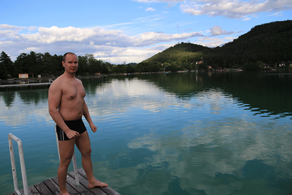 Jag var först väldigt tveksam till vattnet, och visst var det rätt så svalt efter att jag hoppat i också. Men i kombination med bastu ute på bryggan blev det helt fantastiskt. Klopein är för övrigt den sjö i Österrikiska alperna som blir varmast om somrarna, upp till 29 grader.